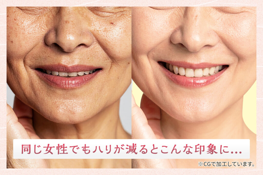 実際に同じ同じ女性でもハリ・ツヤが減少するとこんなに印象が違うんです。