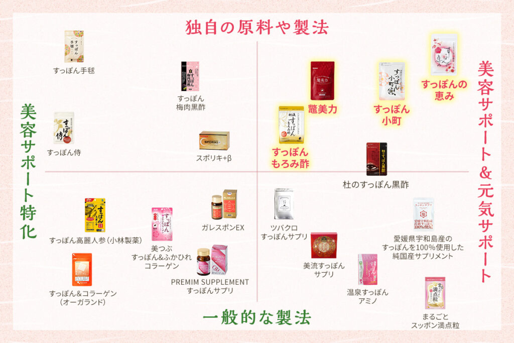 すっぽんサプリ選びでポイントとなる「美容成分を横軸」に「製造方法を縦軸」して一覧化しました!