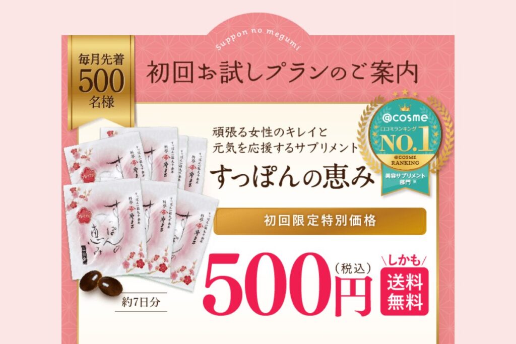 「すっぽんの恵み」は通常価格1ヵ月分で3,690円(税込)のところ…なんと初回7日分で500円(税込)。さらに送料は無料。これならお得な価格で長く続けられますよね。