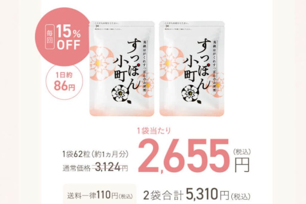 通常価格は3,124円(税込/62粒・約1ヶ月分)。ですが、2ヵ月に2袋の定期コースであれば1袋あたり2,655円(税込)で購入することができ、1日あたり約86円で続けられます。さらに「定期縛りなし」「30日間の全額返金保証」もついているから、初めての方でも安心して試せるのが嬉しいポイントです。