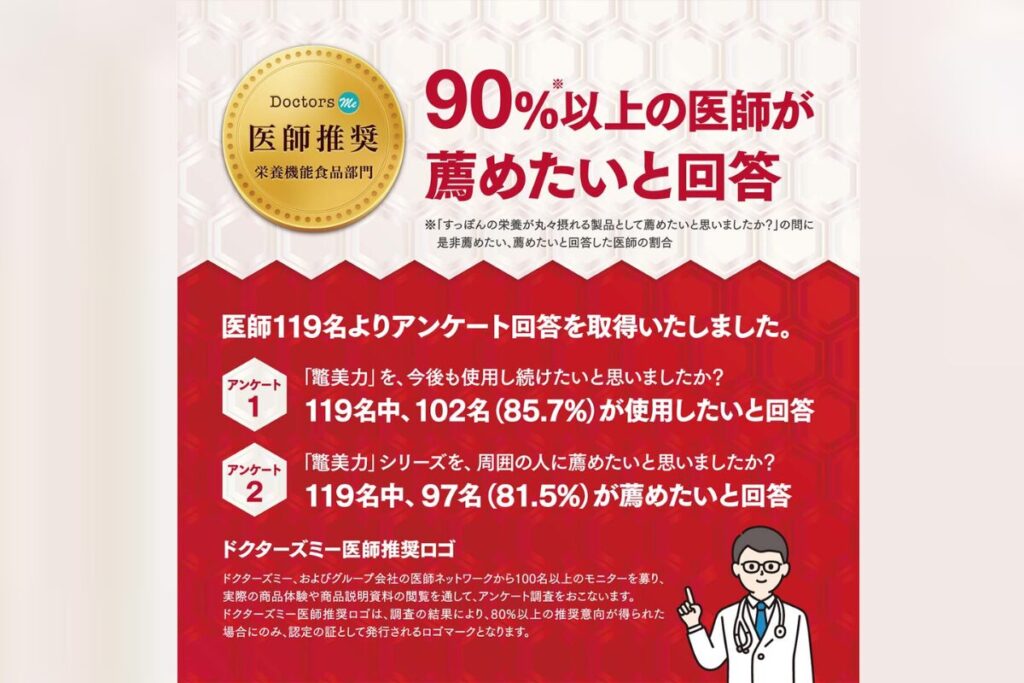 さらにドクターズミーという医師や栄養士、薬剤師などさまざまな専門家が健康に関する質問に回答する信憑性のあるサイトで、119名医師に質問したところ、90%以上の医師が鼈美力をおすすめしたいと回答しています。