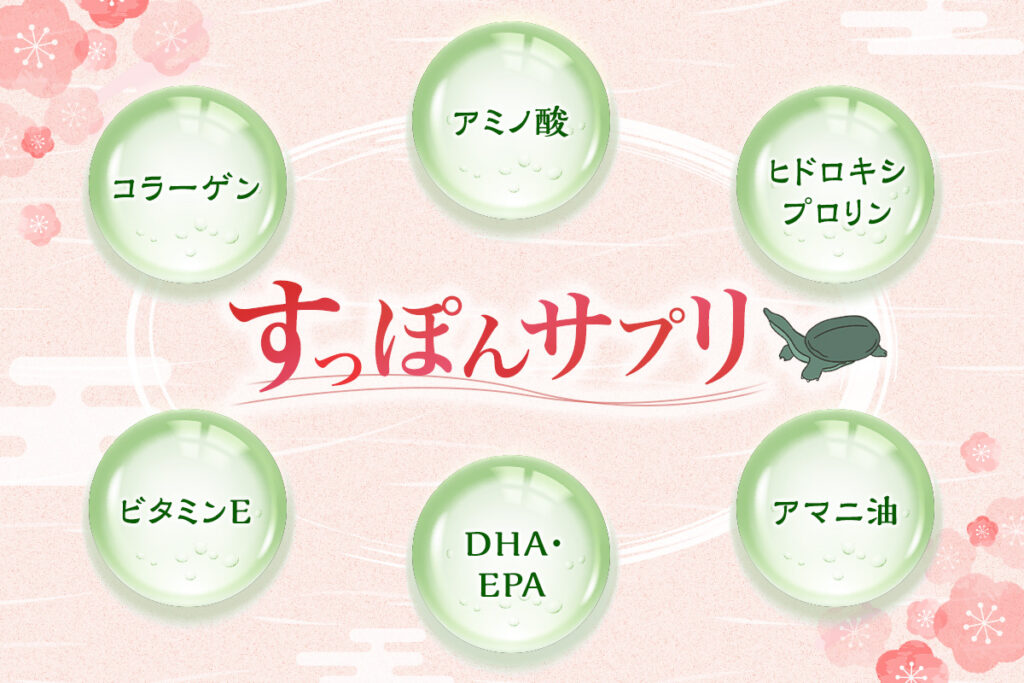 コラーゲンやアミノ酸を豊富に含むすっぽん粉末・すっぽんオイルをベースに、アマニ油・DHA・EPA・ビタミンC・ビタミンEを配合。